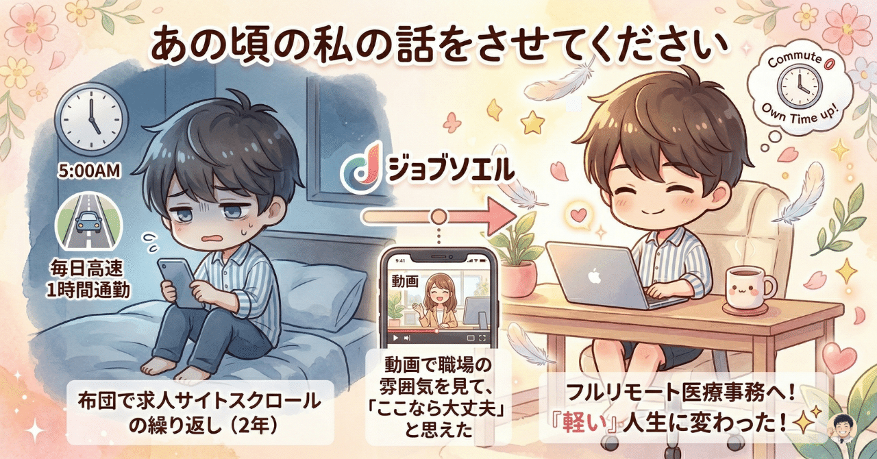 ただ、ひとつだけ救いだったのは、しんどかった時期にたまたま登録していたジョブソエルで、今の職場を見つけられたこと。