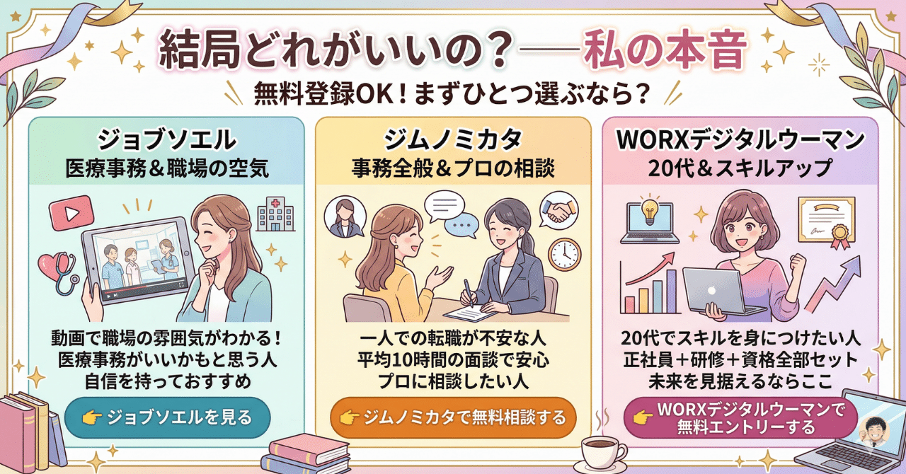 私自身、今のフルリモート医療事務の求人は、ジョブソエルで見つけたんですが、募集開始からたった数日で締め切りになったと後から聞きました。あの時「とりあえず登録だけ」していなかったら、あの求人には出会えていなかった。今の生活は、なかったかもしれない。
