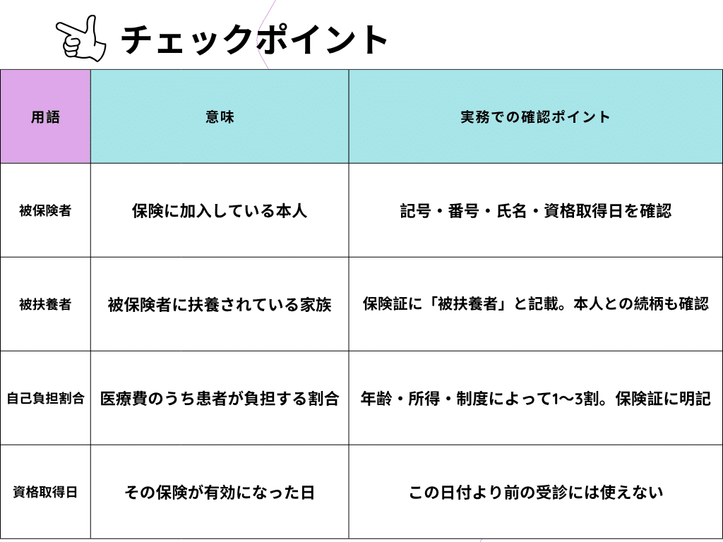 窓口ではまず「誰の保険か(本人or家族)」「いつから有効か」「何割負担か」を見る習慣をつけましょう。