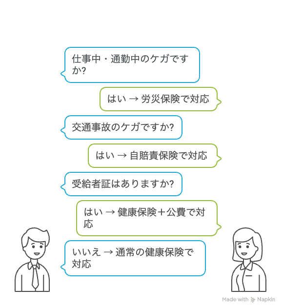 質問①「お仕事中や通勤中のケガですか?」→ 労災保険の可能性
